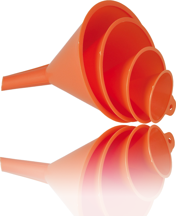 Assortiment de 4 entonnoirs plastique avec bec d'écoulement droit.